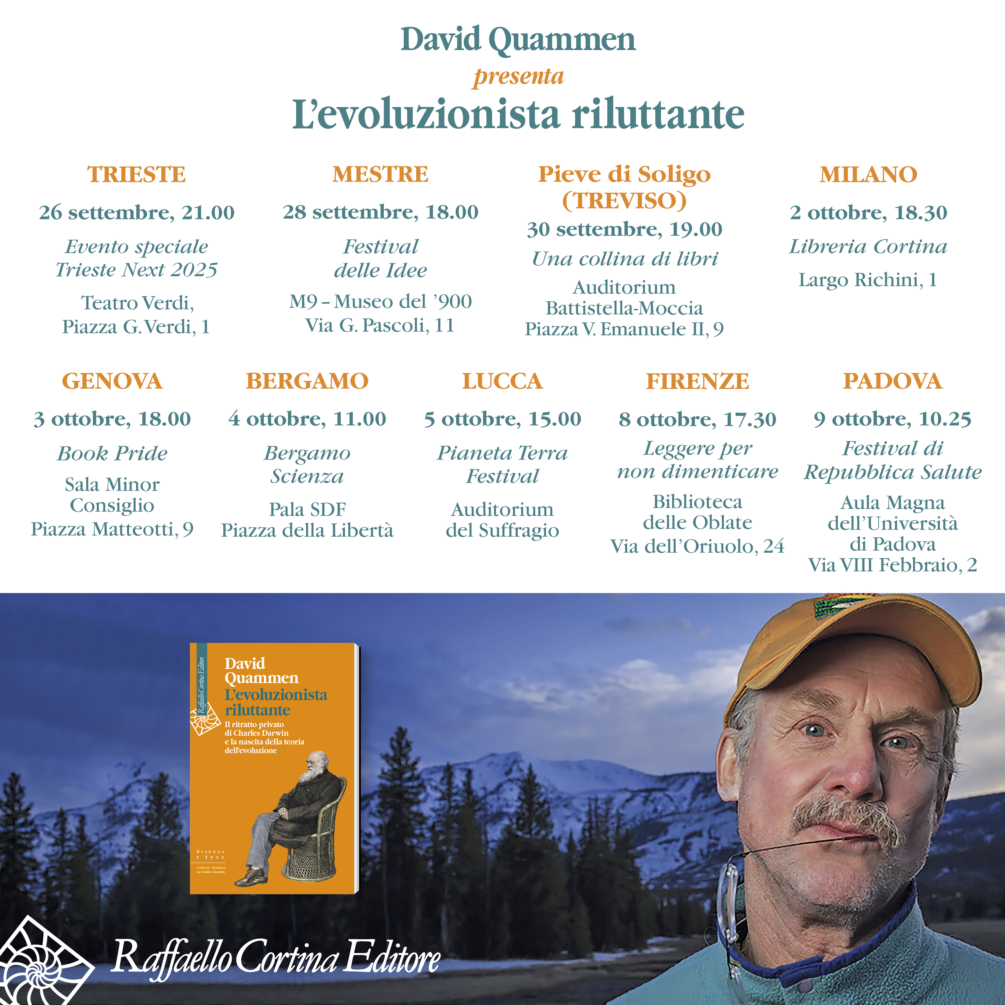David Quammen (L'evoluzionista riluttante) sarà in Italia in autunno. Di seguito la lista in aggiornamento degli eventi in cui sarà possibile incontrarlo.