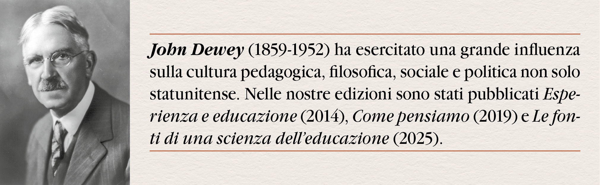 John Dewey (1859-1952) ha esercitato una grandissima influenza sulla cultura pedagogica, filosofica, sociale e politica non solo statunitense. Dewey diede inizio al movimento dell’“educazione progressiva”, che influenzò profondamente le istituzioni formative a lui contemporanee, portandole a una svolta di tipo esplicitamente democratico. Nelle nostre edizioni ha pubblicato Esperienza e educazione (2014), Come pensiamo (2019) e Le fonti di una scienza dell'educazione (2025).