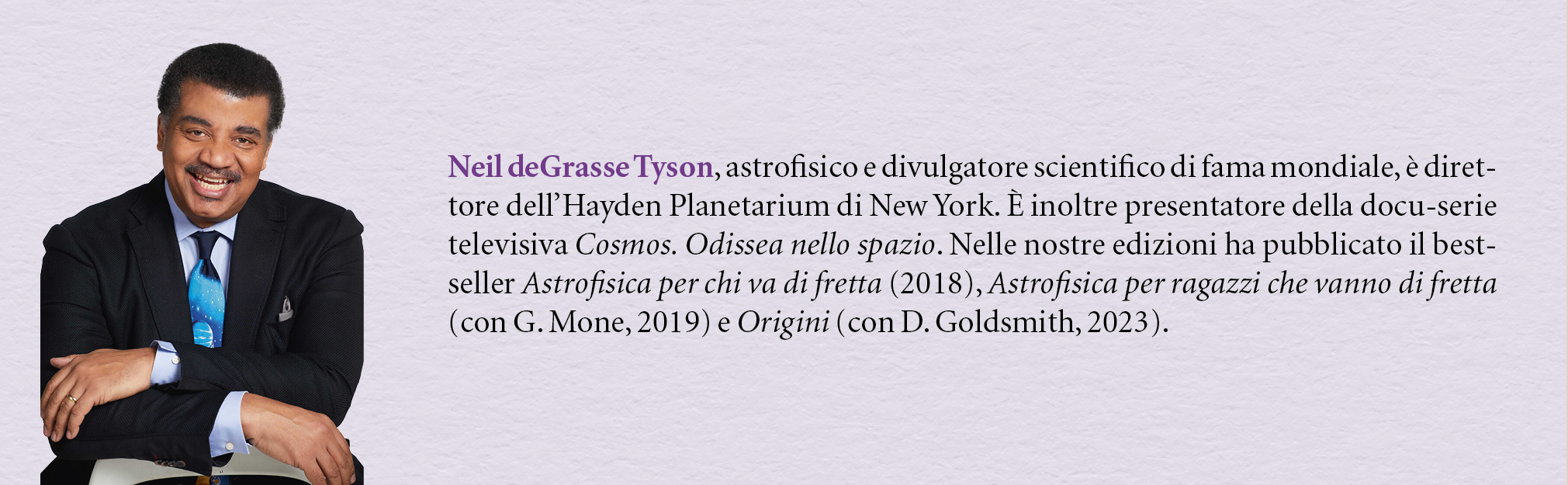 Neil deGrasse Tyson, astrofisico e divulgatore scientifico di fama mondiale, è direttore dell’Hayden Planetarium di New York. È inoltre presentatore della docu-serie televisiva Cosmos. Odissea nello spazio. Nelle nostre edizioni ha pubblicato il bestseller Astrofisica per chi va di fretta (2018), Astrofisica per ragazzi che vanno di fretta (con G. Mone, 2019) e Origini. Quattordici miliardi di anni di evoluzione cosmica (2023).