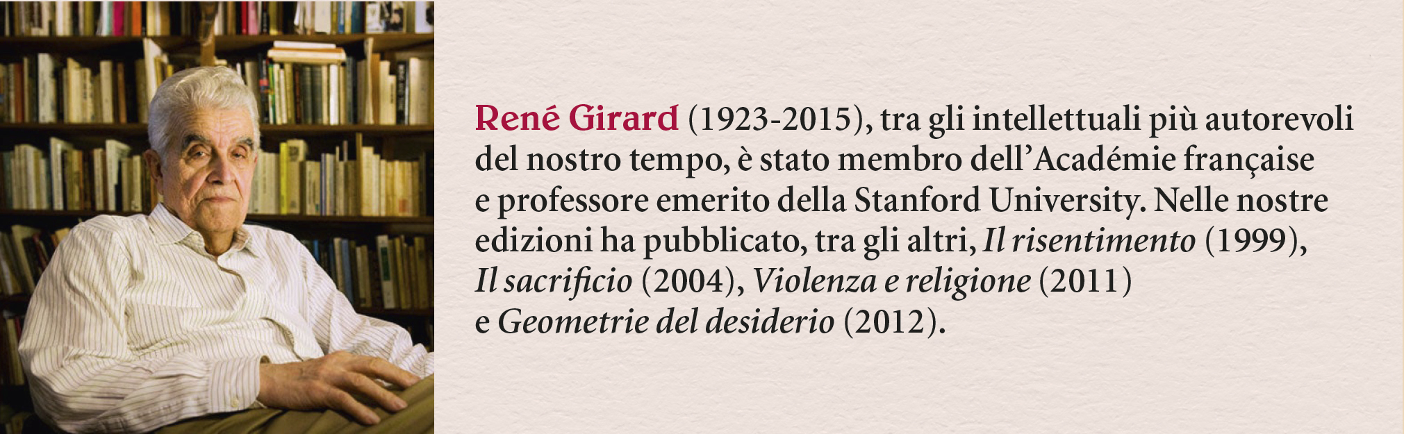 René Girard è tra gli intellettuali più autorevoli del nostro tempo. Nelle nostre edizioni ha pubblicato Il risentimento (1999), Origine della cultura e fine della storia (2003), Il sacrificio (2004), Violenza e religione (2011) e Geometrie del desiderio (2012).